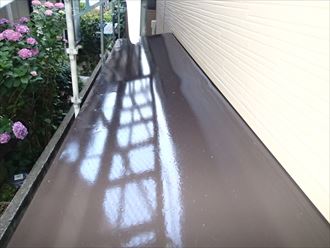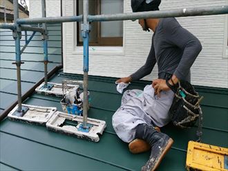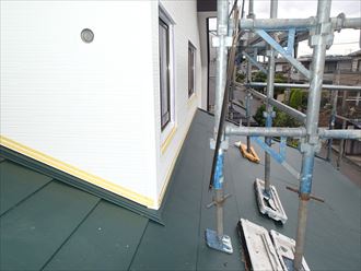 お客様の屋根形状が切妻でしたので順調に作業は進行いたしました!下屋廻りには壁との取り合いがあるため、最終処理は外壁カバー工事と合わせて行って行きます。