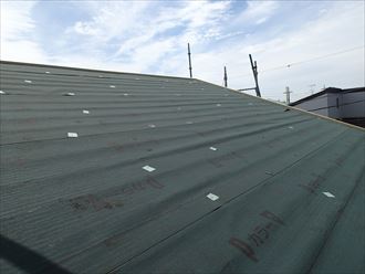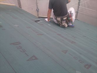 屋根面をしっかりと乾燥させた後に既存屋根から棟包みの板金を撤去して、軒先唐草、ケラバ水切りなどの約物と防水紙を敷設していきます!