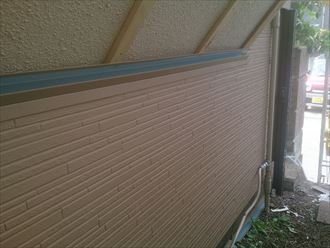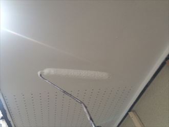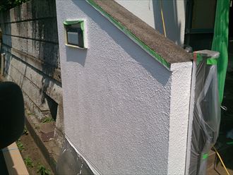 破風巻板金に絡んで増し張りをおこなった、軒天のケイカル板にももちろん塗装を行います。全体のイメージ変更も兼ねて玄関擁壁も外壁の白に合わせた塗装を行いました。