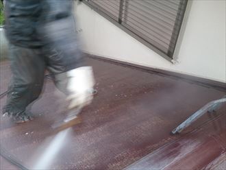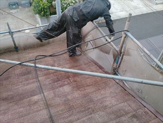 屋根カバー工事の着工にあたりまして、点検でもご覧いただけた屋根面のコケ、汚れを高圧洗浄にて洗い流します!養生のメッシュシートに付着した汚れが、お客様の屋根ががんばってきたときの長さを感じさせていました😭
