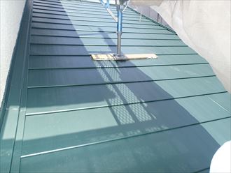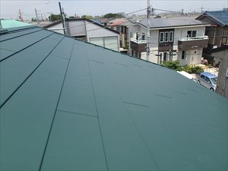 お客様と悩みながら決めた色の緑がとても際立っています。二階の温度上昇の抑制に換気棟も設置いたしました。これからが夏本番を迎えるにあたって効果が出るでしょう。