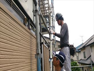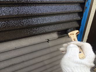 雨戸などの付帯部分は塗装にて処理をおこなっていきます。外壁の茶よりも濃い茶で塗装を行いました!