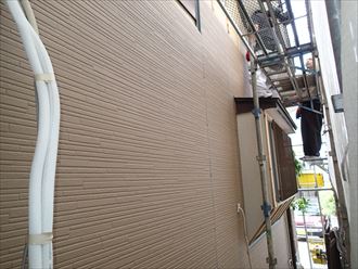 壁には既存のガスや電気のケーブル類が付いておりますが、そこをうまくサイディングを加工しながらの作業となるため難所はなかなか作業は進みません。根気のいる作業です👍✨