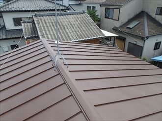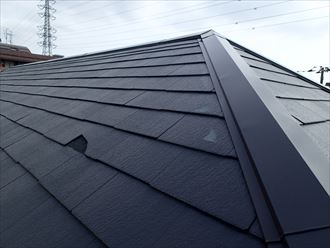 | 最後に棟の設置を行います。まず先端の部分を固定し、他の部分もハンマーで叩いて、木材に填めて、仮に固定していきます。歪みが無く、真っ直ぐ設置されていることを確認してから、ビスで本固定していきます。この工程をもって、屋根葺き替え工事は完了です。 | ||