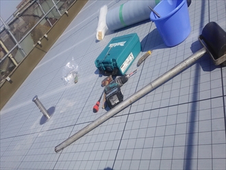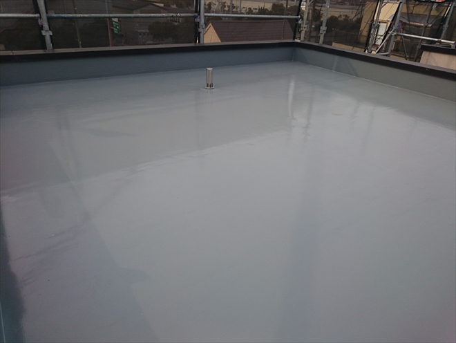 ウレタン防水を二回塗ったあとに紫外線から防水層を守る為のトップコートを塗って完成です。通気緩衝シートと脱気筒によって湿気を効率よく逃がすので、今後は膨れなども起きにくくなります。