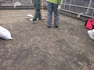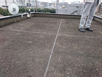 鉄骨造の建物の屋上には屋根が架かっているのではなく、平らな床面に防水が施されていました。屋上は通路を隔てて二か所に分かれれており、同じ様に納めていました。アスファルト防水の上に、防水が傷まない様に保護するためのモルタルが塗ってあります。近くに公園があるので飛んできた砂が屋上の床に堆積しています。