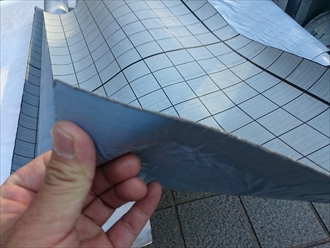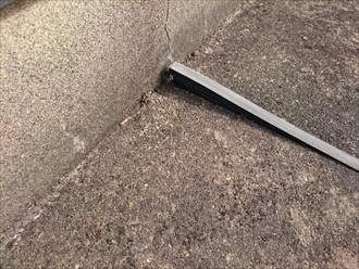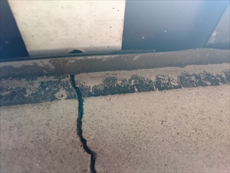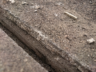 経年劣化で反ってしまうと、目地の部分に砂などが詰まってしまい、ヒビ割れが起きてしまいます。笠木という金属を外して下の状態も見てみましたが、防水が笠木の下まで立ち上がっていませんでしたので、新たに防水する場合はここまで施工する必要があります。
