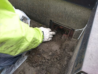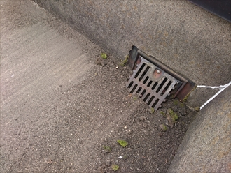 モルタルの為に下の防水の劣化状態を確認する事は出来ませんが、傷みが出ているのは間違いありません。二ヵ所の屋上にそれぞれ一か所ずつ排水口があるのですが、砂が排水口の回りに溜まっていて雨水の流れを阻害していました。
