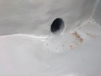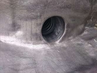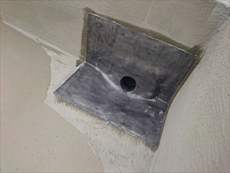 排水口の回りは雨漏りの原因に一番なる部分で、塩化ビニル製の排水管と金属製の排水口との取り合い部分に切れ目が入りやすく、そこから雨水が防水層の下に入り込んで雨漏りしてしまいます。