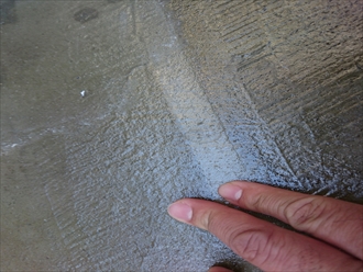 元々樹脂製の目地材が詰めてあった部分は、コーキングを打ちます。弾力性がありますので、動きに追従してヒビ割れを起こしにくくしてくれます。また、雨水を防ぐ効果がありますので、目地からの雨水の浸入も防ぎます。