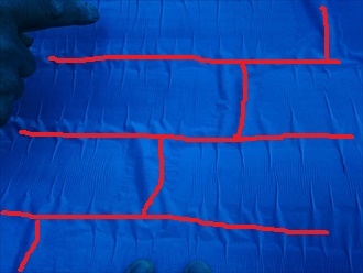 今回の防水工事は、元々あるアスファルト防水の上におこないますので、下から上がって来た湿気を逃がす『通気緩衝工法(つうきかんしょうこうほう)』でおこないます。画像の通気緩衝シートを敷く事で湿気を逃がす事が出来ます。