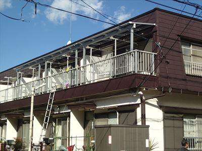 | 今回の芝様のお住まいは、小高い位置にあります。 ご覧のとおり階段や壁の隙間に足場を架設する必要がありました。 また、部品はスタッフが手作業で移動させます。(担ぎ込み)。 |