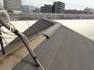 | 解体した屋根材を元に戻していきます。 棟板金も解体してしまったので、復旧していきます。 復旧後はきれいに清掃をして、補修工事完工です! |