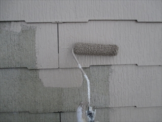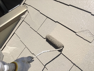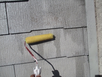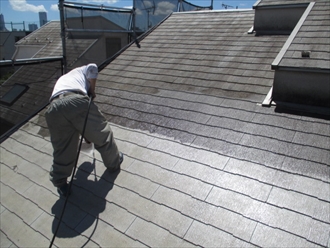 塗装工事は3回塗りで仕上げていくのですが、1回目は下塗りといって、屋根材と仕上げの塗料の付着性を高める為に必ず必要になります。