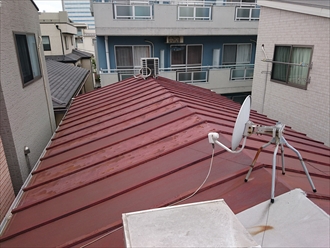 川崎市宮前区の建物は、築30年のトタン葺き屋根でサビて穴が開いている所があります(>_<)