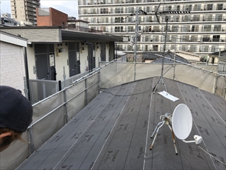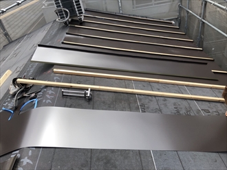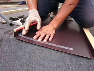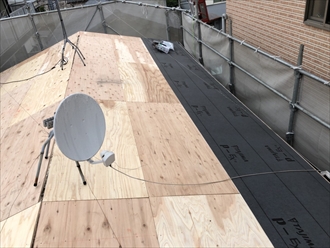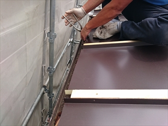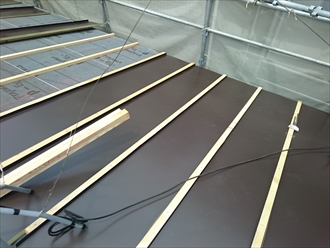 重なりをしっかりと設けて屋根全面にルーフィングが敷き終えたら、新しい屋根材を葺き始めます。