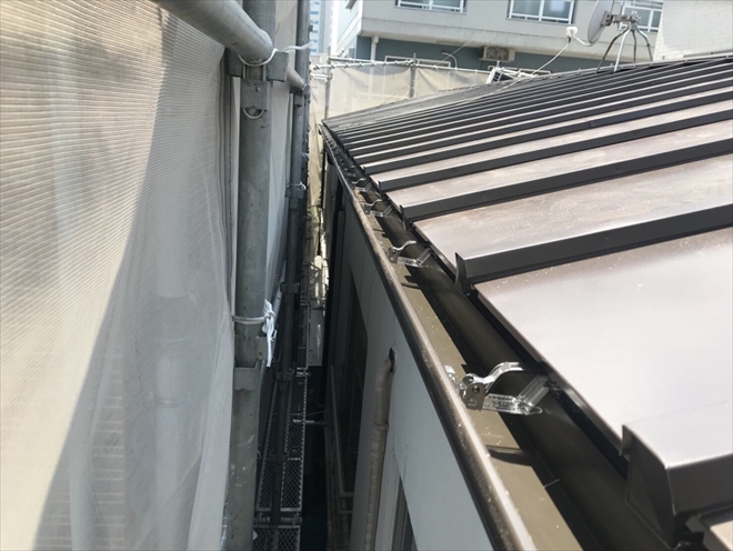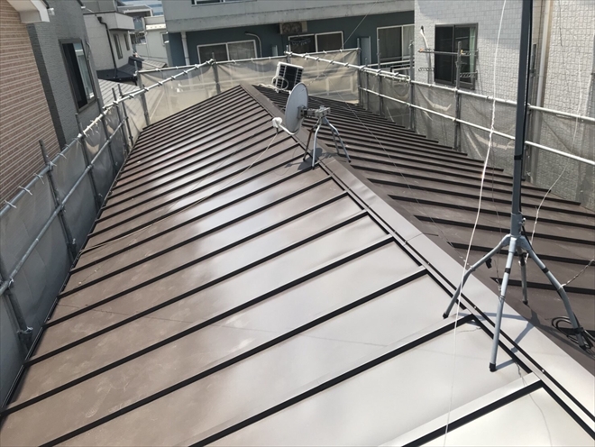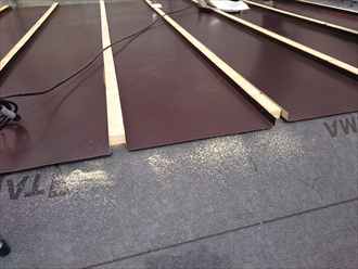 骨組みの垂木と同じ位置に固定した瓦棒と瓦棒の間に板金を納めてから、瓦棒の上にカッパというフタをして納めます。