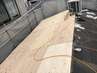 新しい野地板(コンパネ)を屋根に敷き並べていきます。
