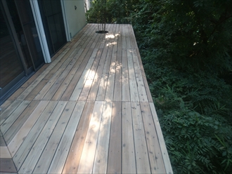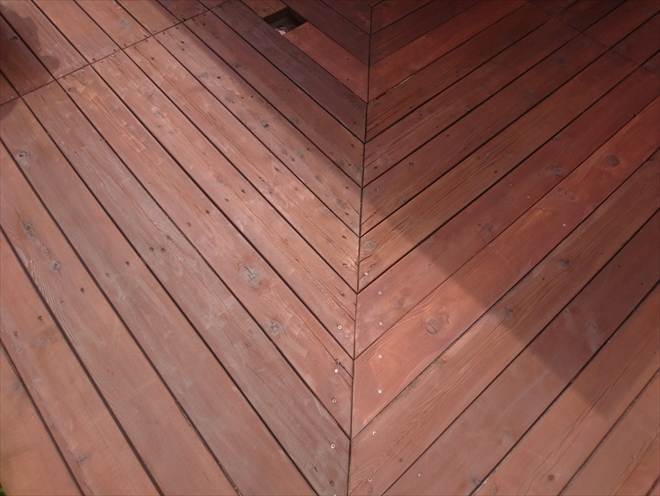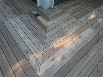デッキ材にキシラデコールが浸透して、ウエスタンレッドシダーの木目がハッキリ出ています。