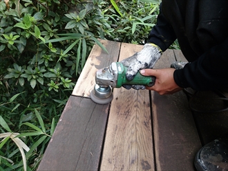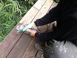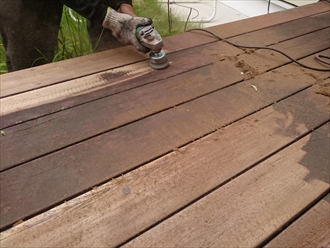 ウッドデッキの表面を削って剥がしていきます。