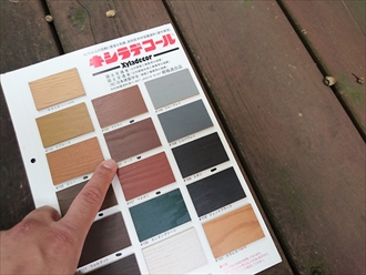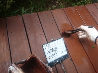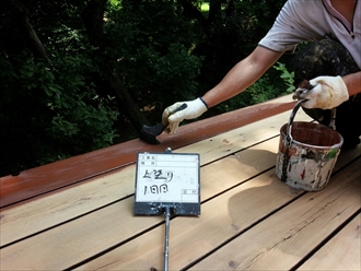 選んだ色は多少赤みかかったチークで、塗った直後はまだテカテカとした見た目ですが、デッキ材に吸い込まれていって木材が保護されていきました。