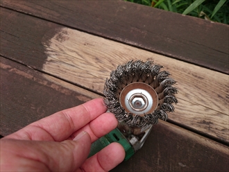 電動工具の先端にワイヤーで出来ているブラシを装着して、古い塗膜を削りながら剥がします。