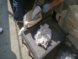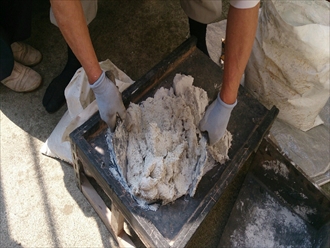鶴首と言う名前のコテを使って漆喰を詰めていきます。