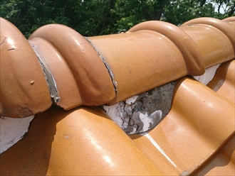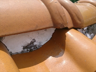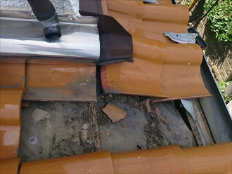 泥が流れて棟瓦の下地が無くなった事で、崩れ始めています!