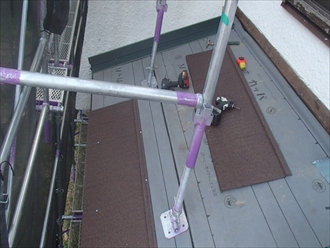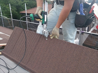 屋根の上にエコグラーニを並べていって早速屋根葺き開始です!