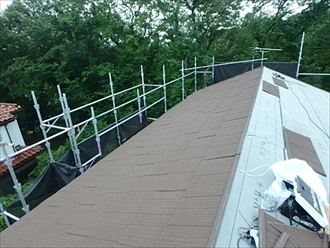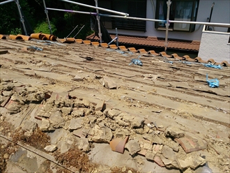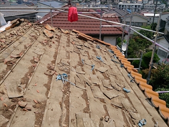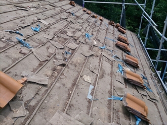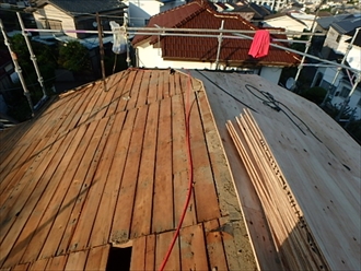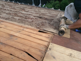 屋根からの雨漏りで下地に傷みが出ていて、全体的に防水紙の劣化があるのでほかの部分も雨漏りする可能性が有りましたので、葺き替え工事を行う事になりました。