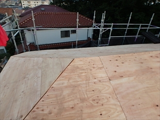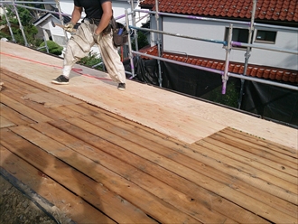 綺麗に防水紙をはがしたら、新しい野地板の合板を貼りかぶせて屋根の強度を増していきます。