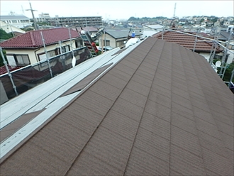 せっかく葺き替え工事をするのであれば、軽い屋根材に変えて建物の負担を軽くする事をお薦めし、ジンカリウム鋼板の『エコグラーニ』を使用しました。
