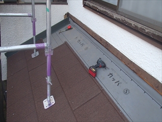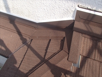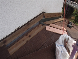 屋根面だけではなく、壁との間から侵入する雨水を防ぐためにもともと取り付いていた水切りを利用して納めていきます。