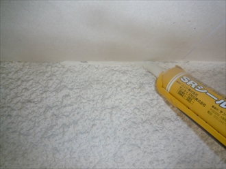 高圧洗浄のあとは軒天と外壁との取り合い部分にコーキングを打って隙間を埋めます!