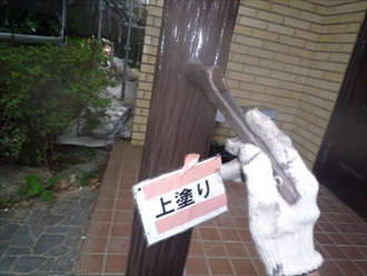 玄関の化粧柱も塗装します。屋根と外壁が綺麗になるのに化粧柱を塗らない訳にはいきません。
