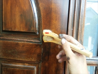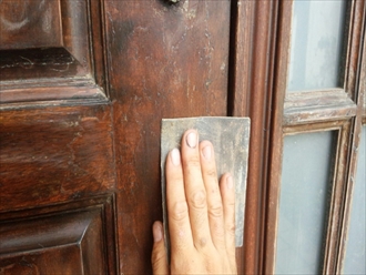 玄関ドアはクリアーが掛けてありましたが、ガサガサになっていてツヤも落ちていましたので、ケレンしてから半ツヤ仕上げにしていきます。
