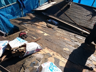 屋根全体の下地に傷みが出ているので、古いスレートを全て剥がして葺き替え工事をおこないましょう!
