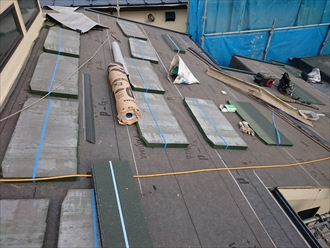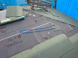 野地板の上に新しい防水紙(ルーフィング)を敷いてから、屋根材を葺いていきます。