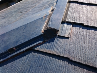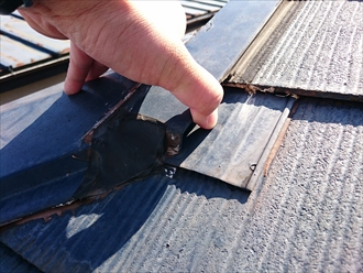 スレート葺きの築20年の屋根は、全体的に割れと反りが出ていて谷部分は雨漏りの原因になっていました。