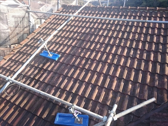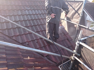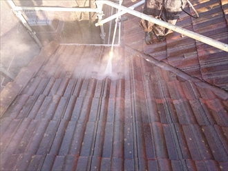 モニエル瓦の表面にあるスラリー層を高圧洗浄で念入りに落としていきます!