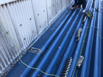 小波スレートのカットが終われば、あとは加工したガルバリウム鋼板を差し込んでいきます。