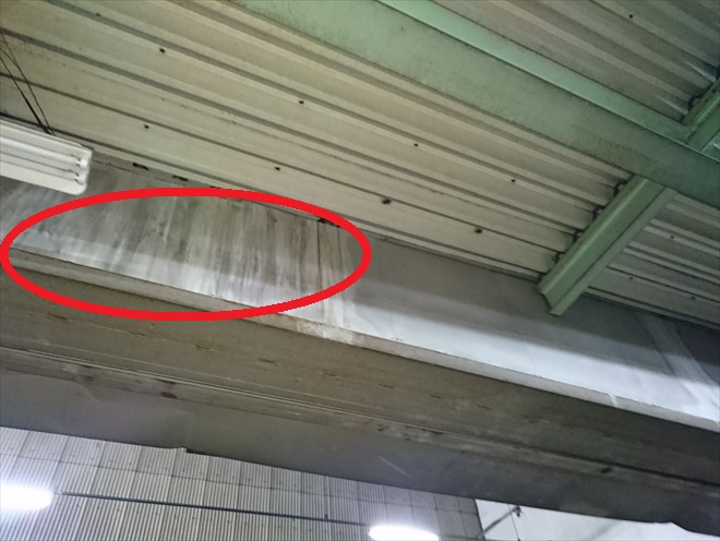 雨漏りしているのは丸で囲った部分で、上から雨垂れが出ていて白い線の様になっていました。