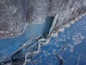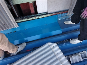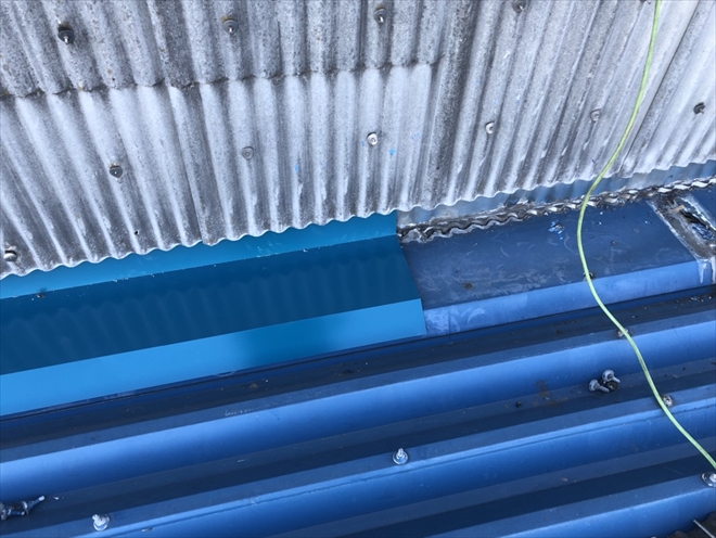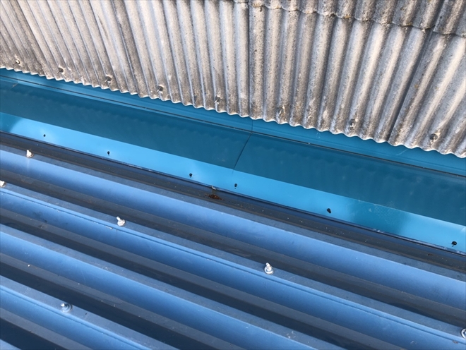 全ての隙間を塞げば良いという訳ではなく、雨水の抜け道として開けておかなければならない部分もありますので、今回は、屋根材と外壁材がぴったりとくっつかない様に雨水の逃げ道を確保しつつ、サビて穴が開いた部分を塞ぐようにガルバリウム鋼板でカバー工事をおこないました。