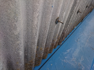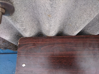 小波スレートの下端と屋根が設置していませんので、外壁を流れてきた雨水が溜まることなく屋根に流れる造りになりました。