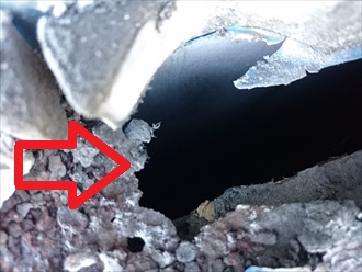 壁の中は矢印の様に穴が開いていましたので、雨水が入りこめば倉庫内への雨漏りに繋がってしまいます😢