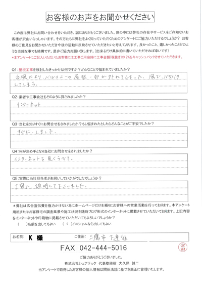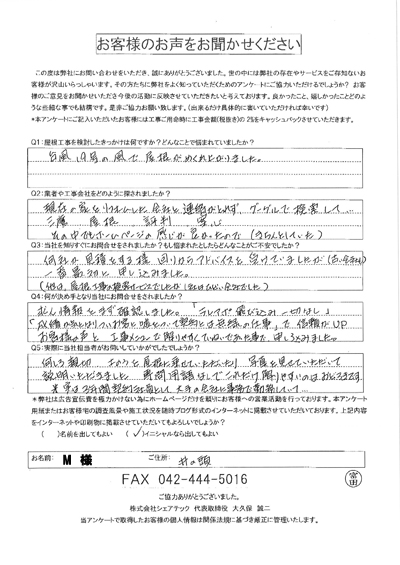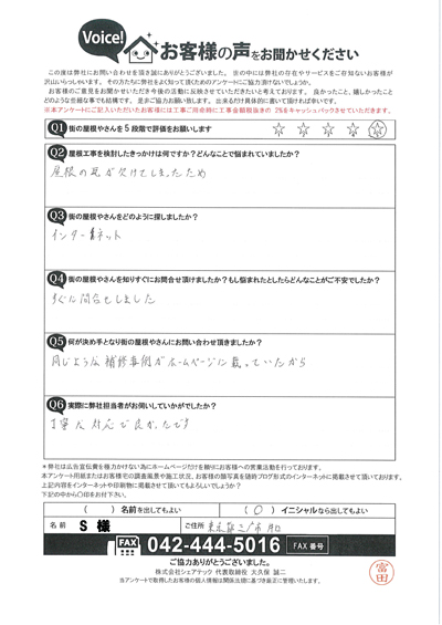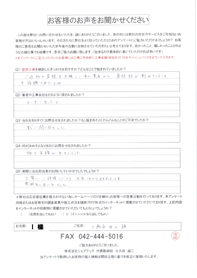 三鷹市上連雀にて窓まわりからの雨漏りを補修いたしました!お客様より頂いたアンケート内容をご紹介します。