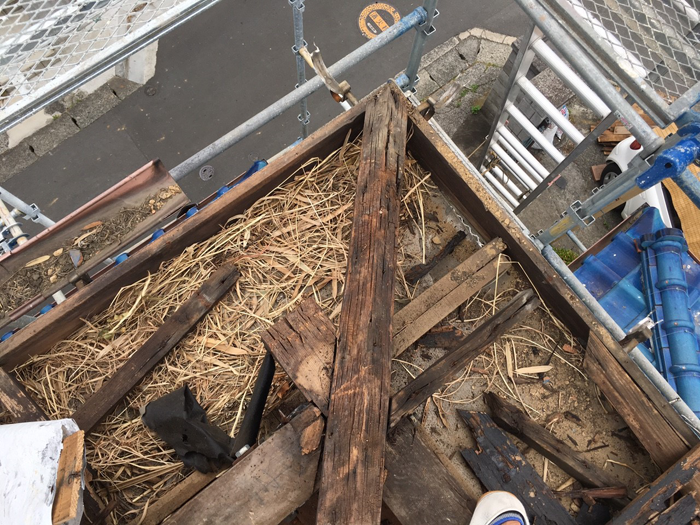 雨樋の取り付け部分である『鼻隠し』の板も腐っていたので今回は、新しい鼻隠しに交換してから雨樋の吊り込み工事をおこないました。