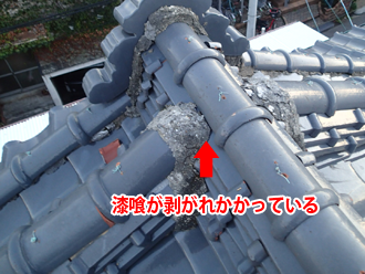 現地を調査したところ、屋根には青い釉薬瓦が葺かれており、一見すると問題ないように見えましたが瓦の下の防水紙が経年劣化により破れ、そこから雨水が浸入している状態でした。