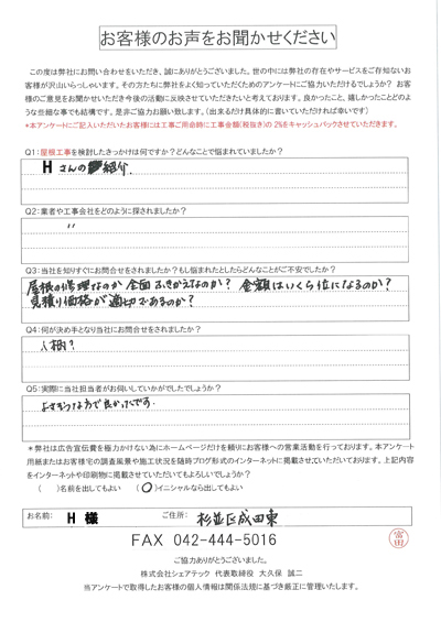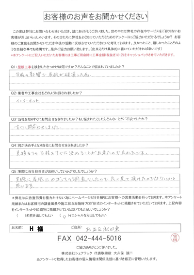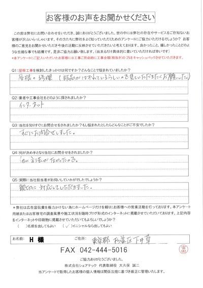 杉並区阿佐谷北にて屋根の葺き替え工事を実施、H様に工事後の感想をお聞きしました