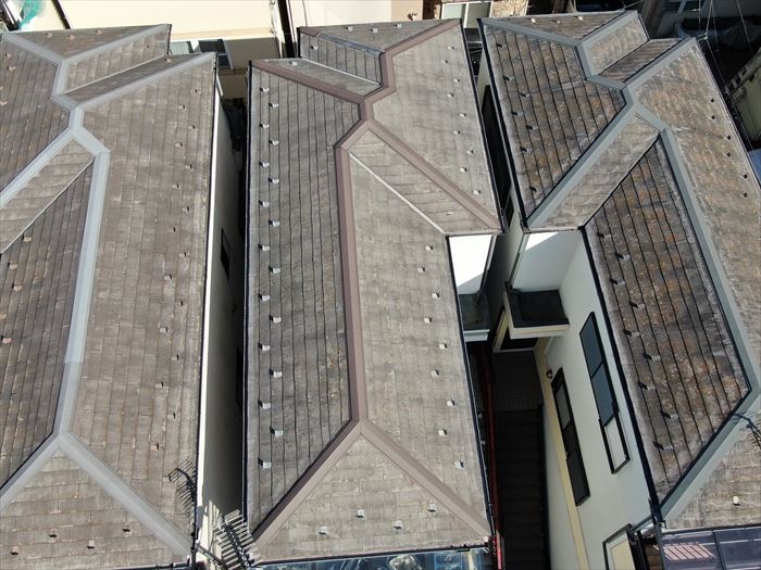 板橋区赤塚にお住いのS様邸にて屋根塗装工事を実施致しましたので作業の様子や費用についてご紹介しております。  工事のきっかけですが「築10年が経過した為、屋根の塗装を検討しています。調査、お見積りをお願いしたい」とお問合せをいただき調査にお伺いいたしました。  S様邸は3階建てで屋根は急勾配となっておりましたのでドローンを使用し屋根の調査を行いました。屋根の状態ですがスレート事態にひび割れ等の損傷は無く問題の無い状態になります。  しかし、新築より10年が経過している為、スレート表面の塗装は経年劣化し色褪せや、撥水性の低下の症状が確認できました。  スレートは塗装により建材を保護している為、メンテナンスを怠ってしまうと屋根材の劣化を早めてしまう原因となります。  調査報告を行い屋根塗装工事のご提案を行いました。メンテナンスの重要性にご理解いただき、工事をお任せいただく運びとなりました。